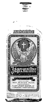 Jagermeister is a highly sweet 70 proof German liquor containing minute quantities of deer blood. It is a reddish-brown cordial with a root beer-like flavor, and it is served extremely cold and syrupy. In Europe it is imbibed primarily because of it's supposed medicinal value, as an after dinner tonic. There are apparently 56 herbs incorporated into the formula, which was invented in 1935. The blazon of the deer is derived from the story of St. Hubertus, a patron saint of huntsmen. After the death of Hubert's beautiful wife Floribana, he wandered the forest despodently, hunting deer. On a Christmas Eve, he recieved a vision of a stag with a glowing cross betwixt it's antlers. He renounced his position as Duke of Toulouse and became a priest, eventually ascending to the position of bishop before his death in 727 AD. The word Jagermeister means Huntmaster, and the text which flows around the label is a traditional hunter's prayer:It is the Hunter's honor that he protects and preserves his game, hunt sportsmanlike, honors the Creator in his creatures. |